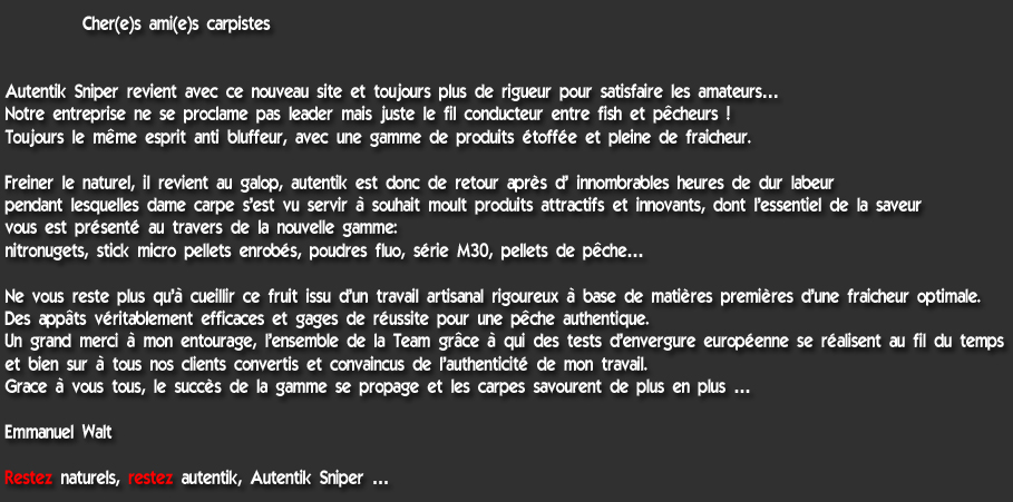 Bienvenue sur Autentik Sniper... le plus grand choix de bouillettes fraiches sur mesure.